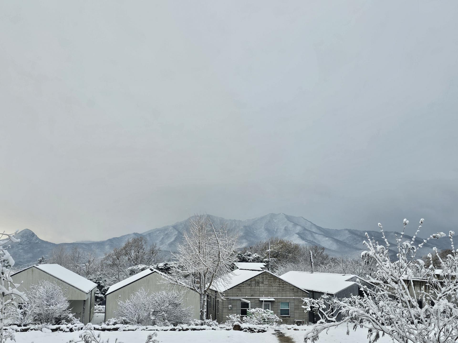 어제 내린 눈이 덜 녹아서 먼발치 산밑으로 허였게 드리워져 있습니다.